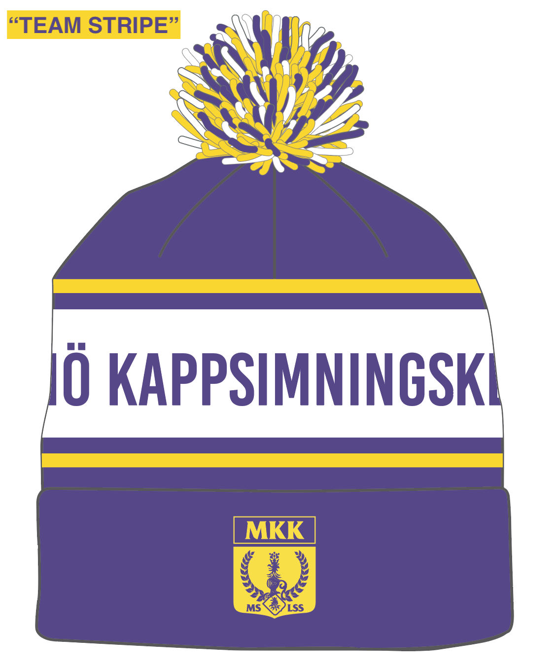 Lila / Vit / Gul stickad tofs-mössa med MKK vapensköld. Emblemet i brodyr.